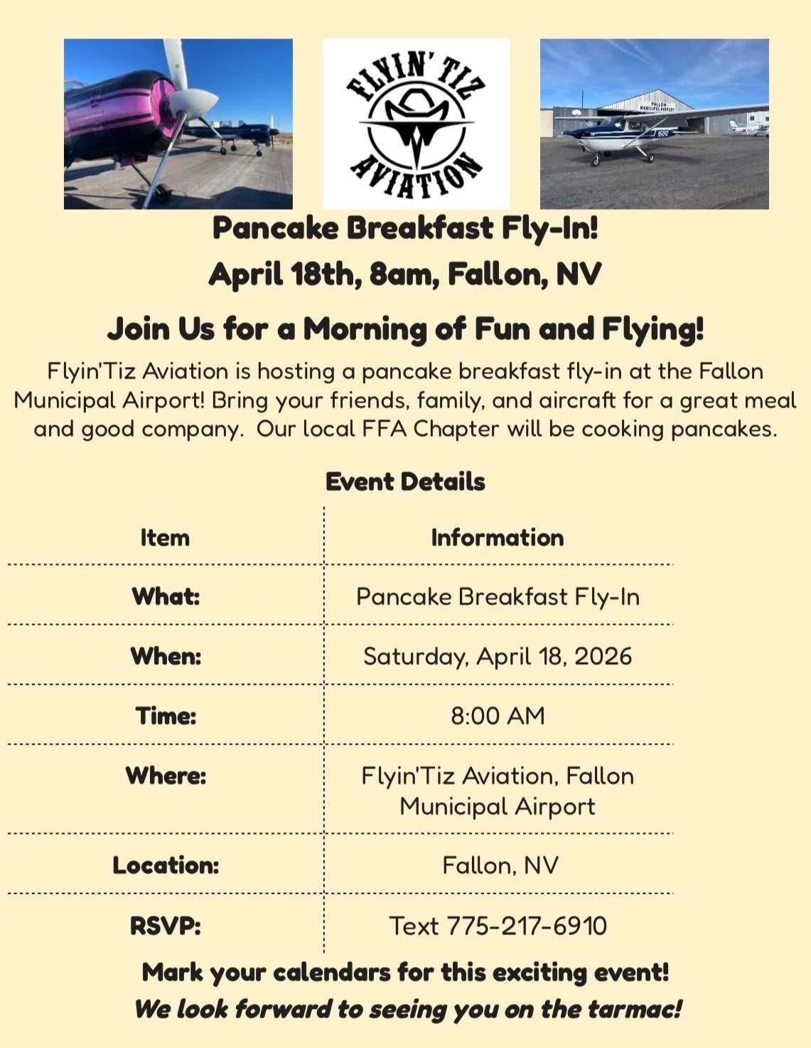 We have regularly schedule events - Monthly Chapter Business Meetings and a frequent Social Dinners at various local restaurants. Chapter business meetings are the 2nd Thursday of the Month, at 6 pm at Atlantic Aviation, Reno and also via Zoom.